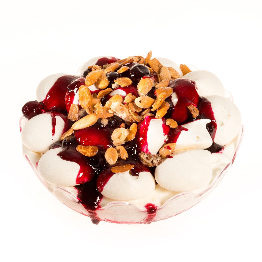 Παγωτό με φρέσκο γιαούρτι, πλούσια γεύση και γαρνιρισμένο με τραγανές μαρέγκες και κρουστές αμαρένες.