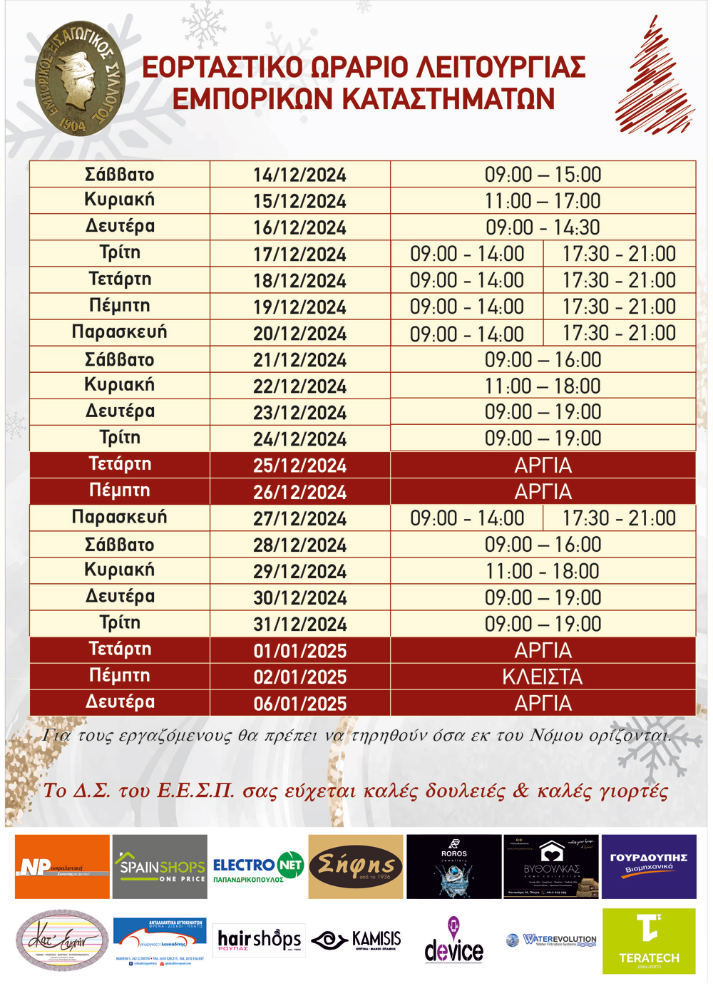 Ο Εμπορικός & Εισαγωγικός Σύλλογος Πατρών ενημερώνει ότι τα εμπορικά καταστήματα τη Δευτέρα 24 Ιουνίου 2024, εορτή του Αγίου...